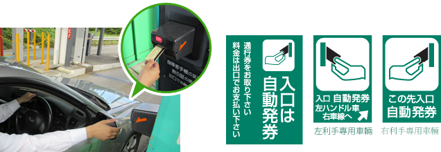 ②在入口收費站,從自動售票機取得您的收費通行券。票券上會顯示車輛分類、入口交匯處的名稱、發行日期和時間及其他資訊。(*部分入口收費站允許現金支付)